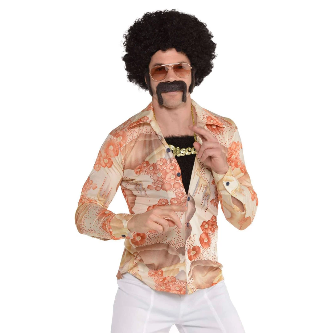 The ultimate 70s look requires hair. Lots of hair. Everywhere. This Men’s Disco Hair Set is all the hair you’ll ever need to complete your jive talkin’ disco, Saturday Night Fever retro 1970s look. This set includes black curly wig, self adhesive sideburns, handlebar style moustache and a rug of chest hair.