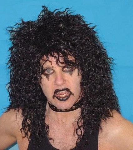 Big black wavy wig. Perfect for Alice Cooper or Kiss or any 80s big hair band. Face paint and studded choker sold separately.