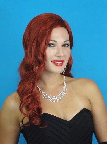 Long, auburn red and wavy, this glamorous costume wig is modeled on Rita Hayworth and excellent for a touch of Hollywood elegance. Â