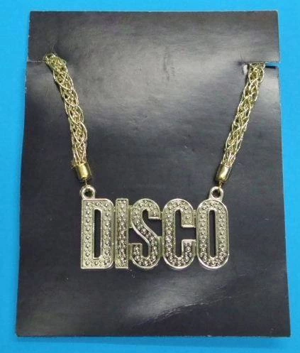 The disco pvc necklace symbol is attached to mesh fabric gold chain is that little accessory to make you feel that 70’s disco fever all over again. Â