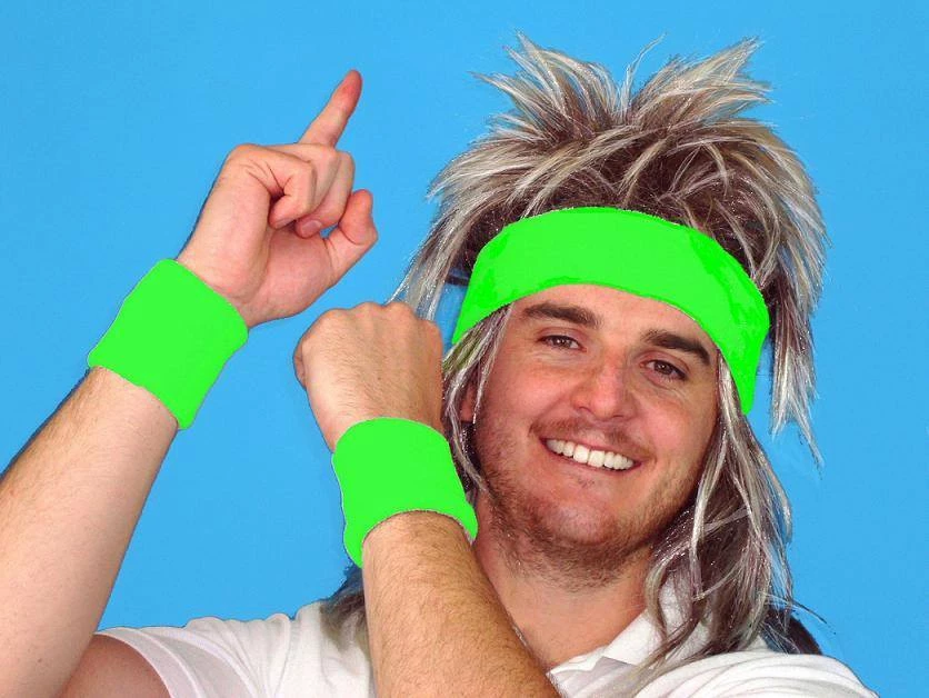 This tennis costume set consisting of headband and wristbands is perfect for an 80’s sports star look! The tennis sets come in white, pink and neon green. Complete your look with one of our mullet wigs.