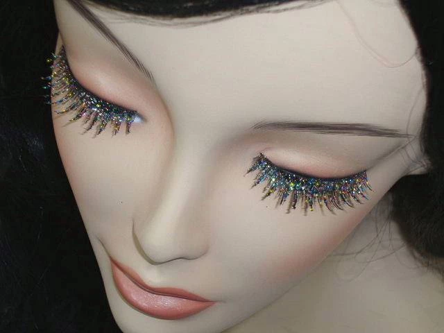 Black false lashes coated in multi-coloured glitter. Great for 80s glam or 70s disco. Includes latex glue.