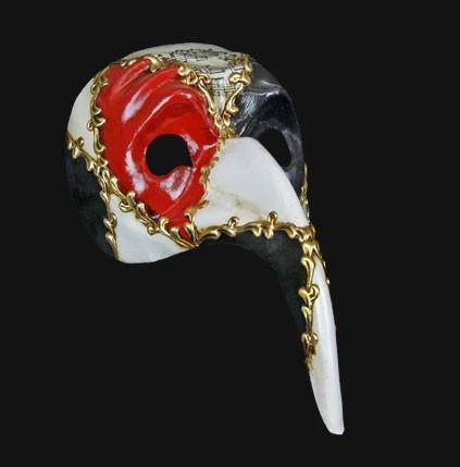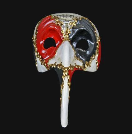This long nosed mask with a Harlequin and music pattern is a classic Venetian style. Choose between a black, red and gold colour scheme or a white, red and black colour scheme, both decorated with musical notation by Vivaldi. Handmade in Venice, Italy. Comes with certificate of authentication.