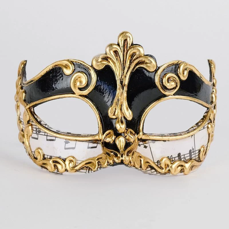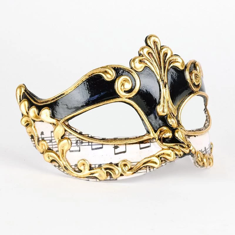 Embody the Carnival of Venice, as red, black, gold and music paper are the traditional signs of the famous yearly event. This handsome eye mask suitable for both men and women is embellished with gold baroque inspired designs and musical notations.Â