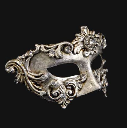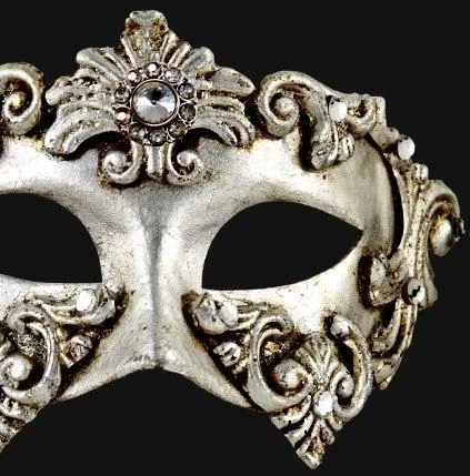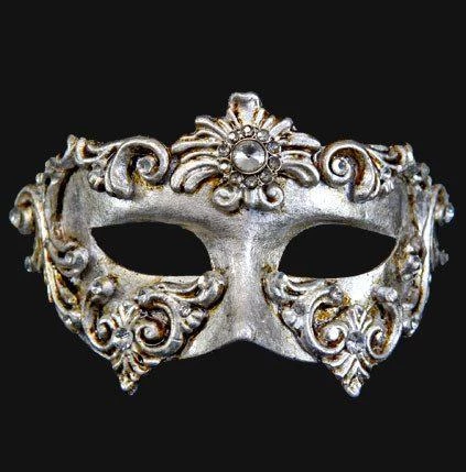 Silver handmade masquerade eye mask with baroque detailing and crystal embellishments.Â