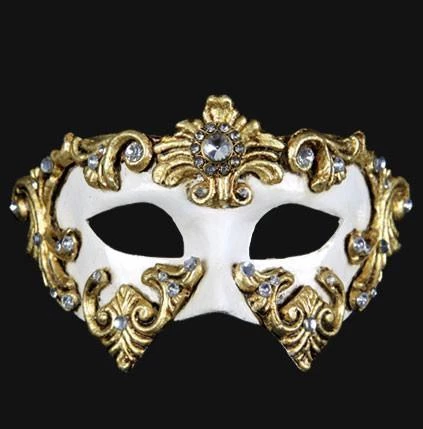 Handmade in Venice, this white and gold eye mask is Inspired by the elegant patterns of baroque decorations in Venetian furniture. Comes with a certificate of authentication and secures with a black ribbon.Â