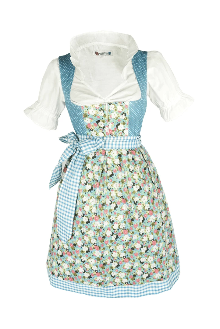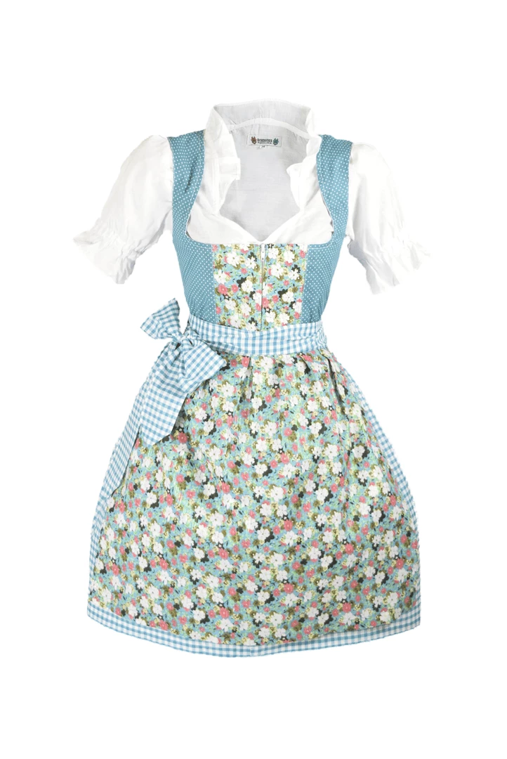 Delightful Oktoberfest Dirndl in turquoise with charming floral highlights. The Franzi Dirndl has been inspired by the sublime colours of an Alpine lake surrounded by a pasture of pretty wild flowers. This Traditional German Beer Girl Costume is a three piece costume which features the turquoise blue and white skirt with attached bodice in contrasting delicate turquoise print, featuring a pretty floral panel. The colours of the dress are set off by the sharp white peasant girl blouse and completed with the matching floral apron. The length is just short enough to be fun and playful without being too revealing, the classic Oktoberfest look.