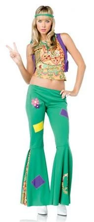 Costume includes green stretch flares with attached patches, halterneck crop top, mini vest, headband and wig of your choice.