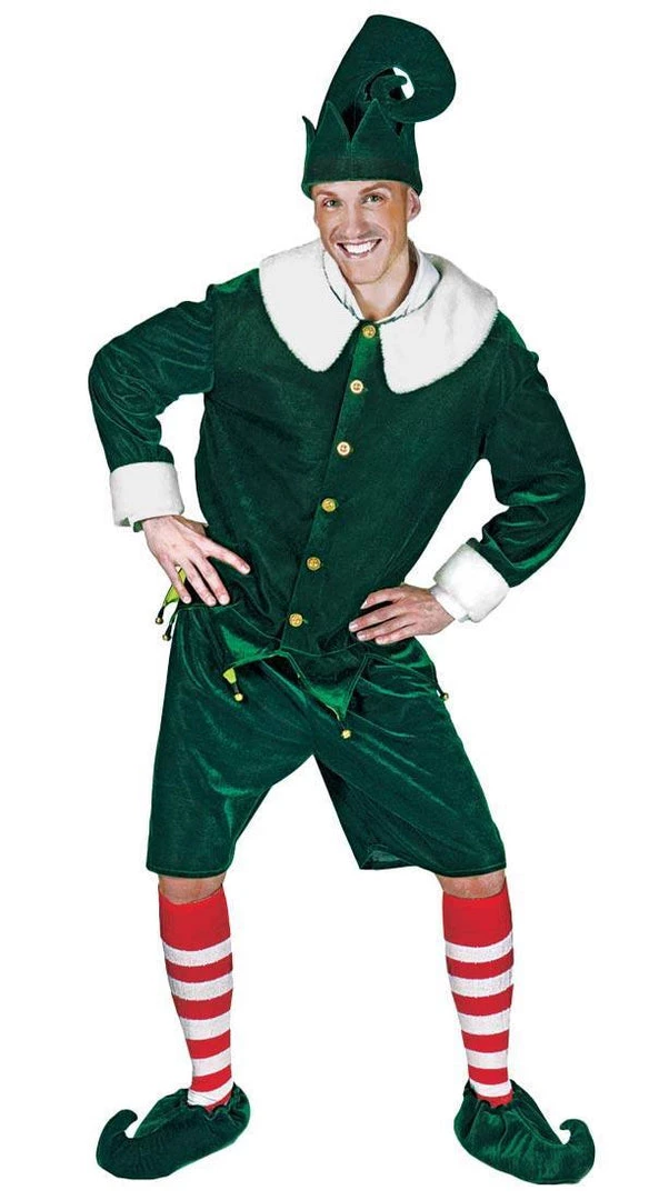 Jolly little Holly Jolly Santa’s Helper Christmas Elf. Costume includes green stretch velvet jacket with attached bells, matching shorts, belt and hat. Shoes and socks sold separately.