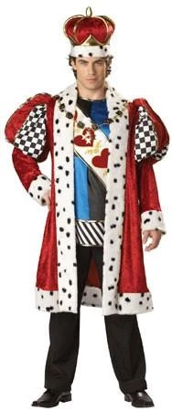 Red velvet coat with fur trim & detachable medallion necklace, blue/black sleeveless shirt, heart sash, crown. Can be worn with trousers or tights.