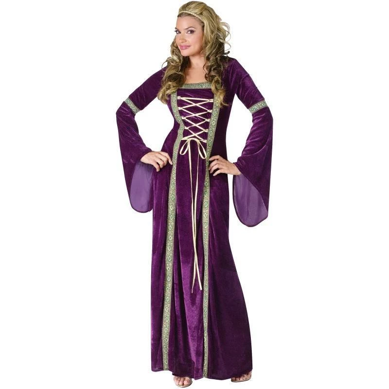 Beautiful purple velvet Renaissance Lady of the Court Medieval Adult Hire Costume gown with gold and green trim and gold lace-up front.