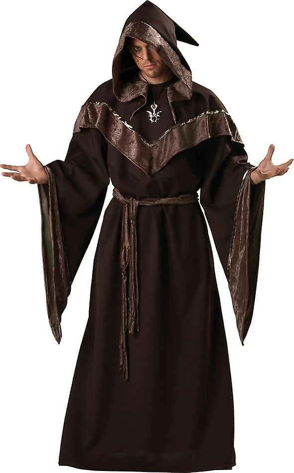 Beautiful quality Mystic Sorcerer Men’s Hire Costume. Long brown gown with crushed velvet trim, matching hood & waist sash.