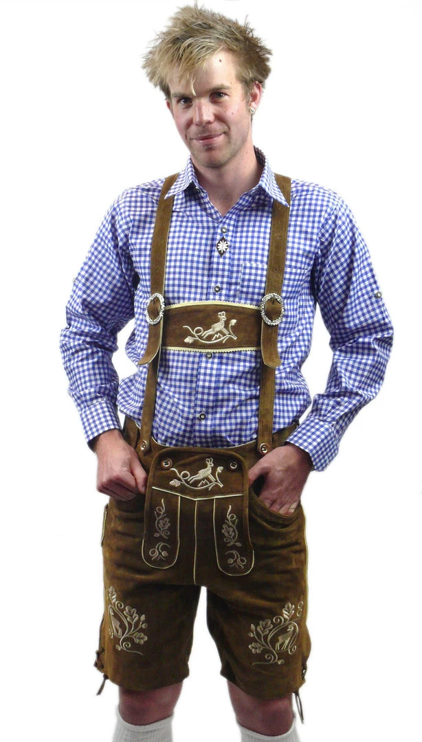 Look the real thing in these authentic suede Lederhosen with matching blue checkered Trachten shirt with embroidery. These Lederhosen are a quality product. We know you will love them!