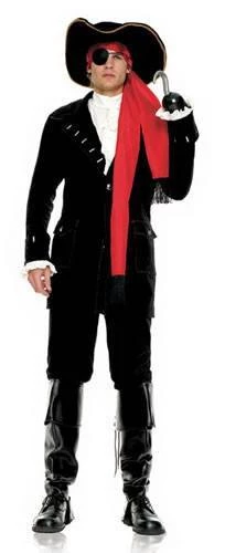 Costume includes black stretch velvet captain’s jacket with attached shirt sleeves, shirt with attached jib, pants, bootcovers, headscarf, hat.