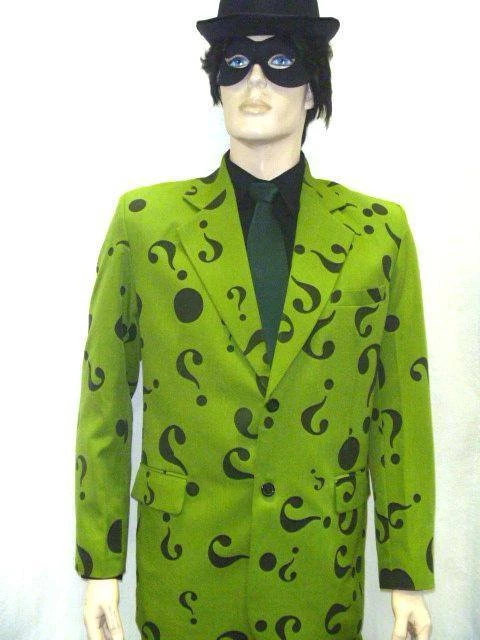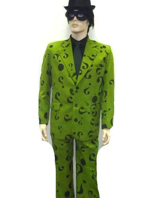 Green single breasted Riddler Men’s Hire Costume suit with black questions marks all over. This Villain Batman Fancy Dress outfit Comes with black bowler hat, shirt and tie.
