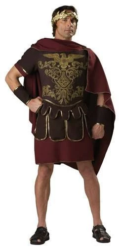 Costume includes brown/maroon tunic with gold decoration, detachable maroon cape and laurel