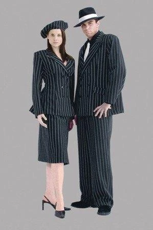 The classic cigar-smoking outlaw gangster moll. Bonnie (from Bonnie and Clyde) gangster hire costume includes pin-striped pencil skirt with matching pin-striped double-breasted jacket and matching over-size beret. Costume comes with wig of your choice. A peroxide blonde bob wig would be the perfect choice to complete the costume.