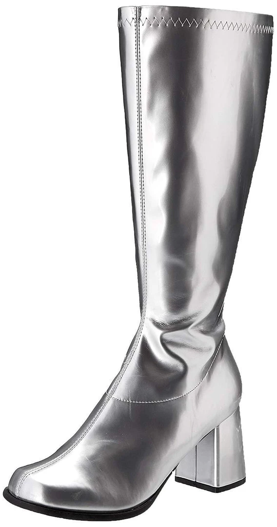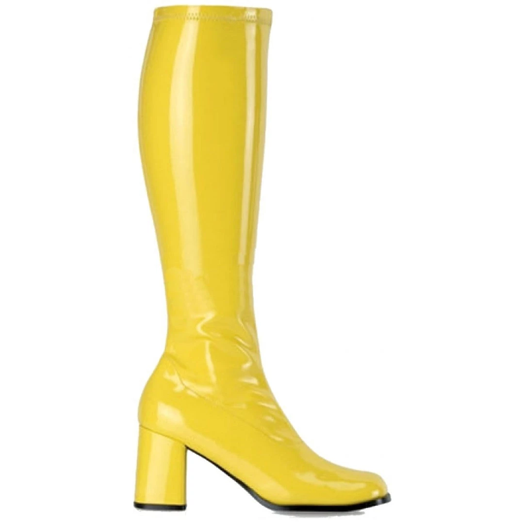 Hire these super groovy gogo boots to complete your 1960s or 1970s costume. These gogo boots have a slender calf fit and are available in white, fuchsia, red, lime, yellow, black, silver, ranging from ladies size 6 to size 11. Click here to hire Gogo Boots in a wider calf fitting, sizes 6 to 12. Our fun and funky boots are gloss vinyl and zip up the inside. The three inch square heel and round toe make these boots a more comfortable fit so you can dance the night away. Perfect for disco and Abba themes and also a perfect accessory to complete your superhero, space, Halloween, or practically any costume.