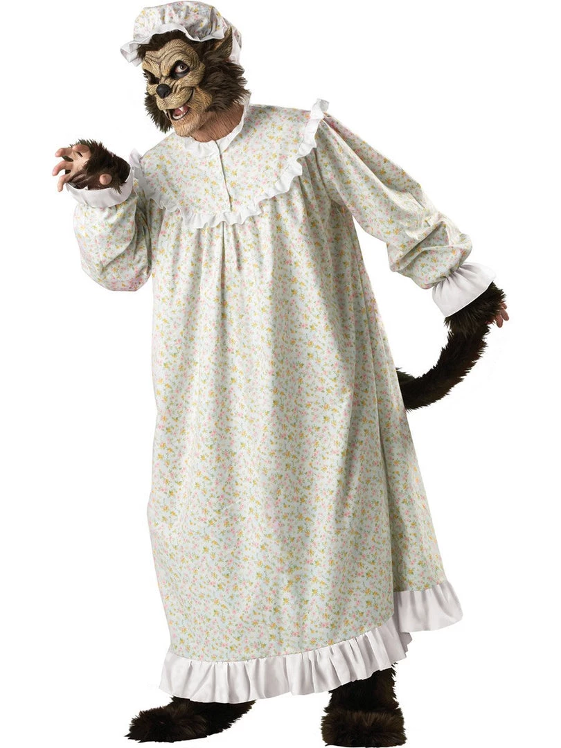 Costume includes granny nightie with wolf tail and matching nightcap, vinyl/plush half mask and plush fingerless gloves.