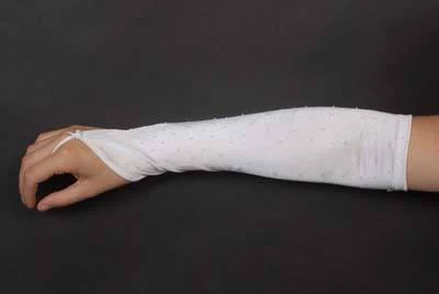 White satin lycra fabric fingerless wedding gloves with stitched on beadsÂ