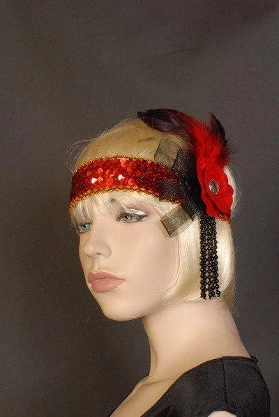 Embrace the rebellious opulence of the Flapper with our beautifully made range of deluxe 1920’s headbands. This red sequinned headband with gold trim features a red felt flower with a silver gem centre and black netting, red and black feathers and dangling black beads.