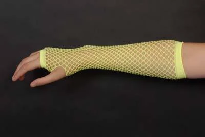 Yellow fingerless fishnet gloves with thumb and pinky holes. Great for Burlesque and 80’s looks.