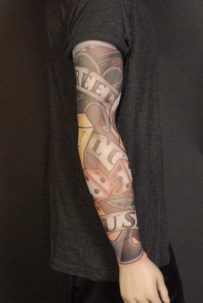 Realistic tattoo sleeve for one arm, themed for a 50’s greaser, featuring lettering and dice and clover motifs.Â