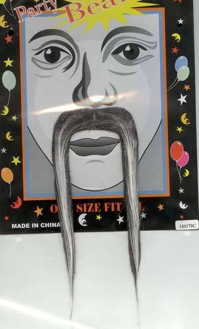 Long grey felt stick on Chinese moustache. Includes, single use adhesive tape. For professional multi-use we recommend to buy spirit gum.