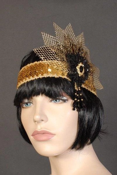 Embrace the rebellious opulence of the Flapper with our beautifully made Maya Lulu range of deluxe 1920’s headbands. The Gold Netting style headband features a gold sequined band embellished with a black sequinned flower with a black stone in the centre, black and gold ribbon and a fan of gold, black and white netting.