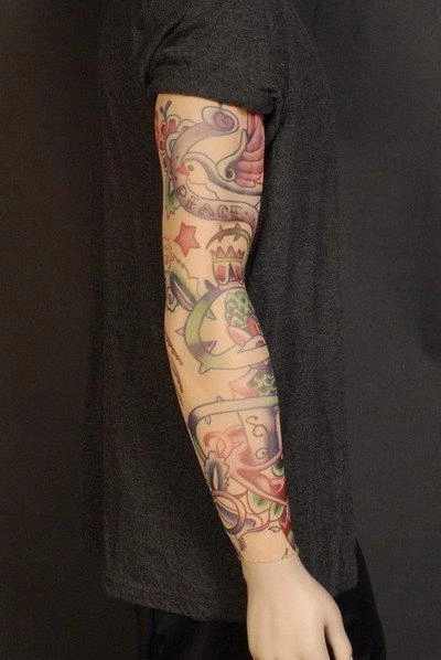 Realistic tattoo sleeve for one arm, featuring peace motifs in purples, greens and pinks.Â