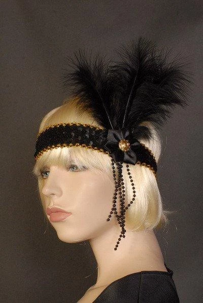 Embrace the rebellious opulence of the Flapper with our beautifully made range of deluxe 1920’s headbands. This black sequinned headband with gold trim features a black ribbon flower with a gold button centre, a black feather and black dangling beads.Â