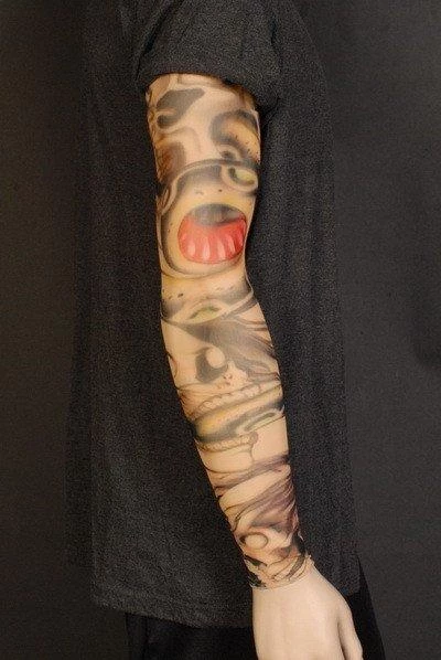 Realistic tattoo sleeve for one arm decorated with skulls and snakes.
