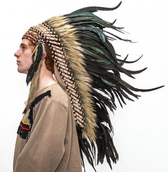 Feathered American Indian Headdress in black rooster feathers. This headdress is a classic trailer style war bonnet: long 40cm-50cm feathers are arranged in an arch formation and strung together to sit at an angle around a skull cap and trail 33cm down the wearer’s back. The forehead is embellished with a colourful beaded design with beaded discs at each temple. From the discs dangle black feather and brown faux fur tendrils that hang 29cm in length. Handmade and of exceptional quality, this is a standout fancy dress accessory that is comfortable to wear, stunning to see and just plain cool to own.