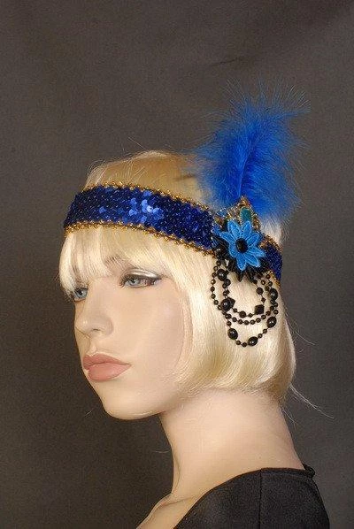 Embrace the rebellious opulence of the Flapper with our beautifully made Maya Lulu range of deluxe 1920’s headbands. This blue sequinned headband with gold trim features a blue woven flower with black woven leaves, a blue gemstone with gold framing, a blue feather and black beads.