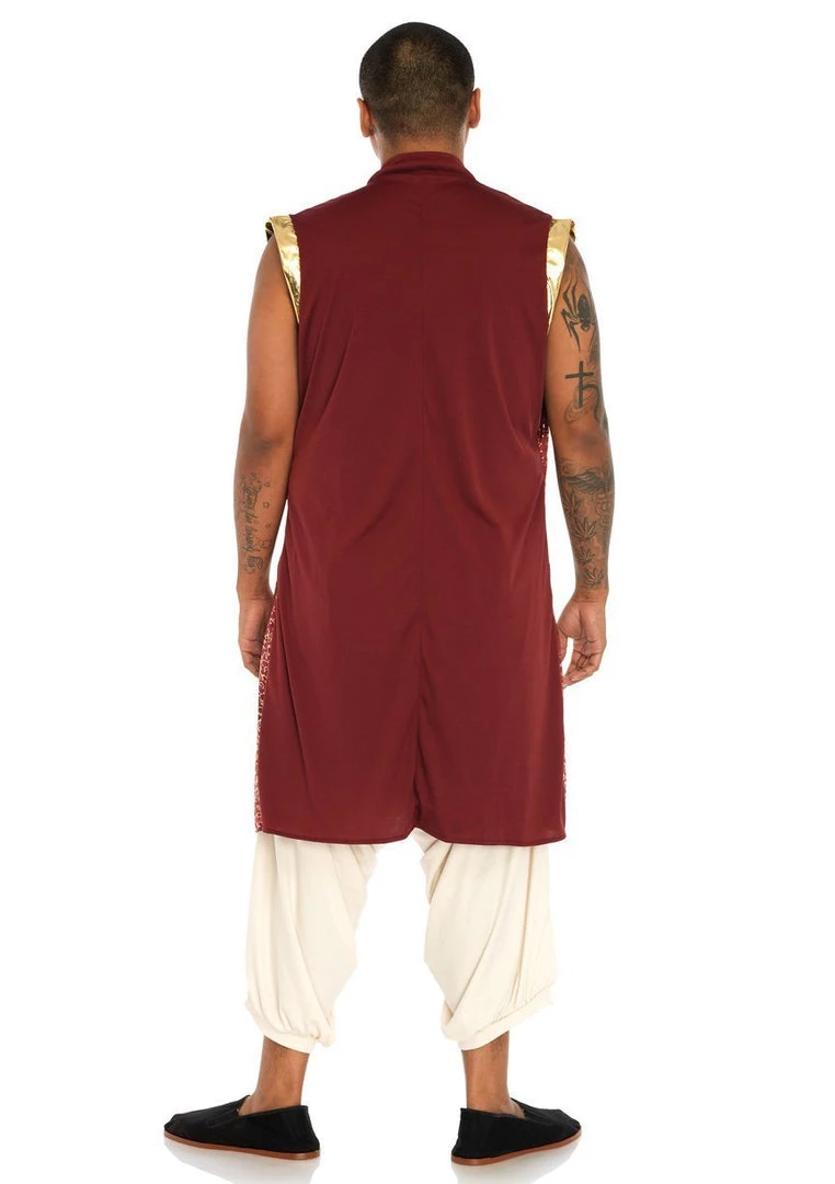 This beautiful men’s costume is great for dressing up as Aladdin or for a Arabian Nights or Bollywood theme party. Prince Al costume is a two piece costume which includes puff 3/4 pants with attached sash to tighten the stretch waistband, and maroon and gold print long vest with attached black sleeveless undershirt with gold trim. All other items sold separately. Matches beautifully with this ladies’ costume.