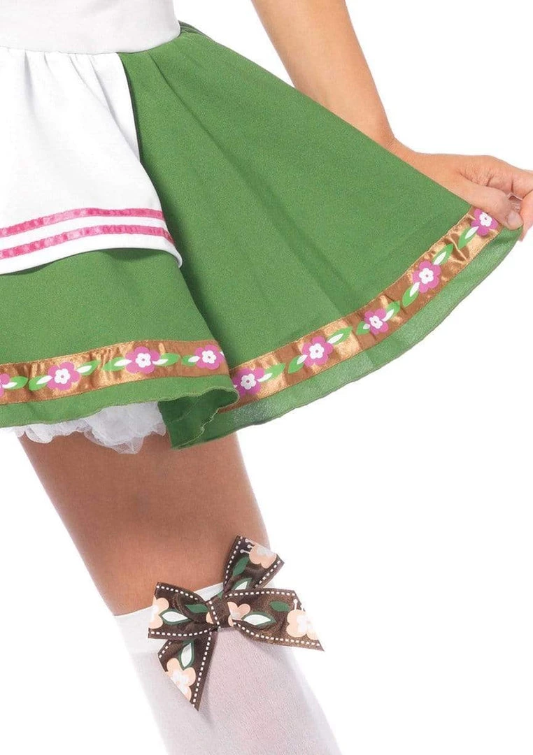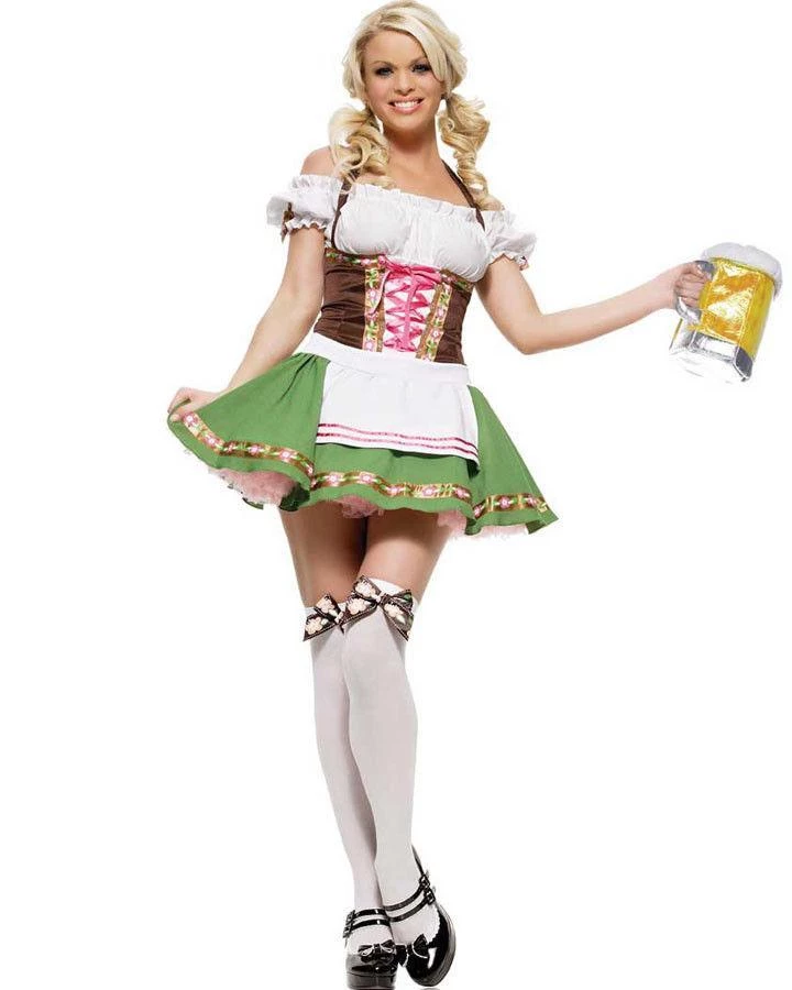 A sweet and sassy version of a traditional German Beer Girl costume for Oktoberfest. This delightful Gretchen costume is peasant girl style dress with ribbon lacing and mini skirt with matching brocade trim and attached apron. Comes with matching hosiery. Beer stein purse, petticoat and all other accessories sold separately. The superior fabric and fit of this quality Leg Avenue costume is designed to flatter your figure while you look fabulous having fun.Â