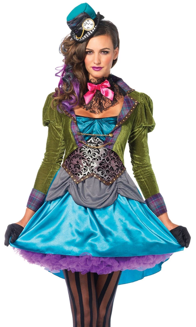 Ladies Mad Hatter costume from Alice in Wonderland. This deluxe costume includes velvet and satin coat dress with hounds-tooth draping and brocade panel detail and mini clock top hat. Petticoat also included with hire. Gloves, hosiery and all other accessories sold separately. Beautiful costume for Disney and Fairy Tale themed parties. Perfect for teachers at Book Week.