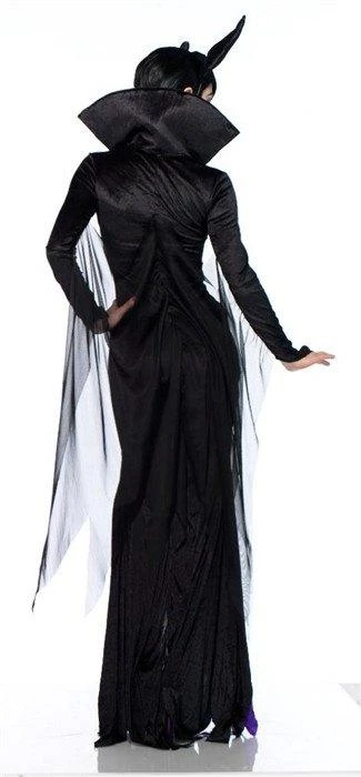 The perfect costume for Halloween! This grand Maleficent costume of the wicked villain from the Disney classic Sleeping Beauty includes slinky satin trimmed velvet dress with sequin embellishment, stay up collar and attached sheer cape, neck piece and horn headband. Raven not included. Coloured contact lenses and matching hosiery sold separately.