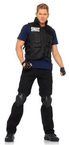 Deluxe Police SWAT Commander men’s costume for hire includes adjustable flack jacket vest with multiple utility pockets and SWAT patches on front and back, dark blue t-shirt, knee pads.Â