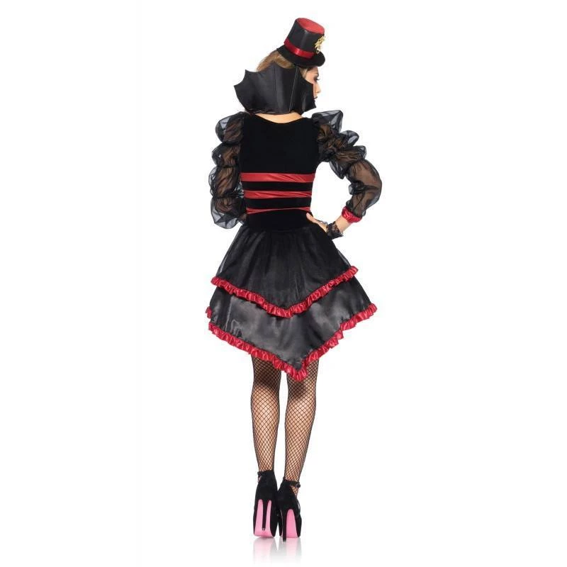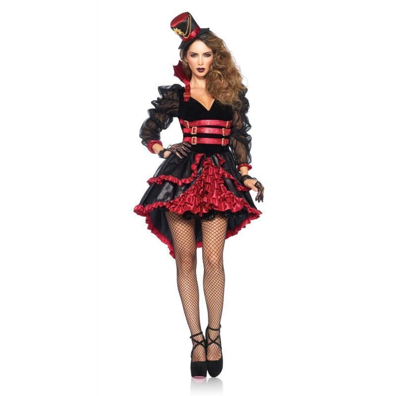 Lush sultry vampire costume for Halloween. Victorian Vamp costume is high/low dress in velveteen and satin with buckle bodice and tiered satin ruffle skirt, detachable collar, and matching hat headband. Hosiery, gloves and all other accessories sold separately.