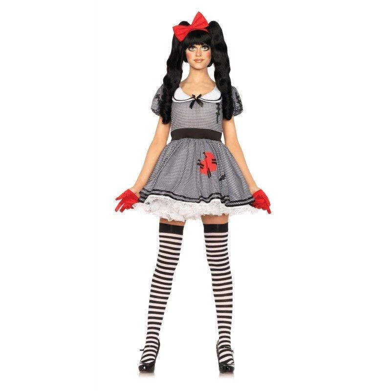 Wind-Me-Up Dolly Halloween costume for adults includes gingham dress with heart detail and attached petticoat and silver turn key accent, headband, a wig. Shoes available at additional hire. Make-up, gloves, hosiery and all other accessories sold separately.