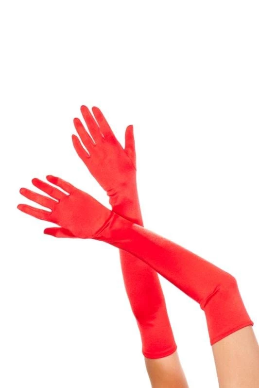 Extra long, “Opera” length stretch satin gloves in red. Great accessory for 1920s costumes.