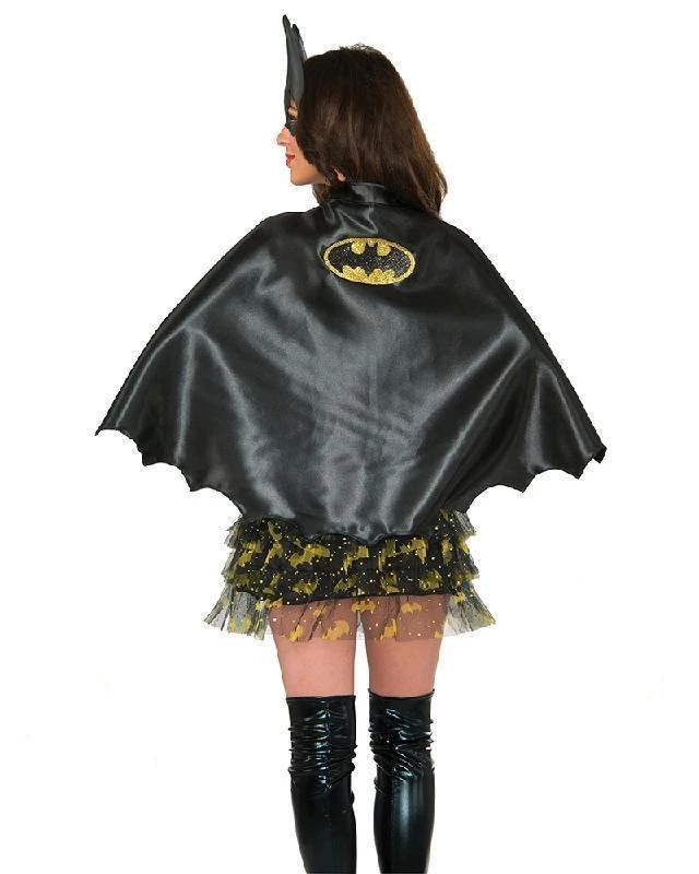 Black satin Batgirl cape with gold and black Bat symbol for Batgirl or Batman (for boys). Package contains cape only. You can’t be a superhero without a cape.