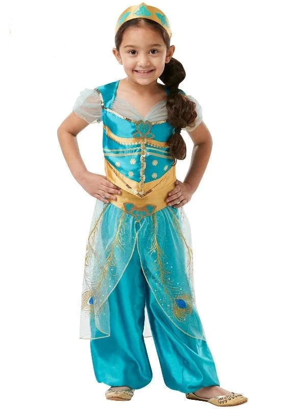 Deluxe Girl’s Jasmine costume from the Live Action Disney Movie, Aladdin. Be the spirited Princess Jasmine, the Sultan’s daughter and Princess of Agrabah in this beautiful deluxe costume for girls which includes:Â