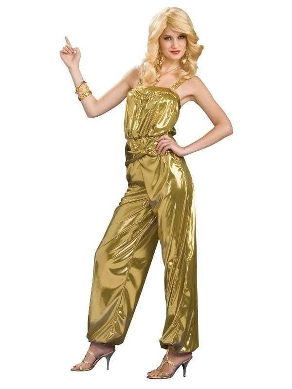 Solid Gold, Dancing Queen, Disco Diva, call yourself whatever you fancy as you travel back to the 1970s when disco fever was all the rage, glitter balls hung from the disco ceilings and flares were trendy! Step back in time and re-live your youth. Great for dressing up as Abba at decades parties or summer parties! Solid Gold jumpsuit includes:Â