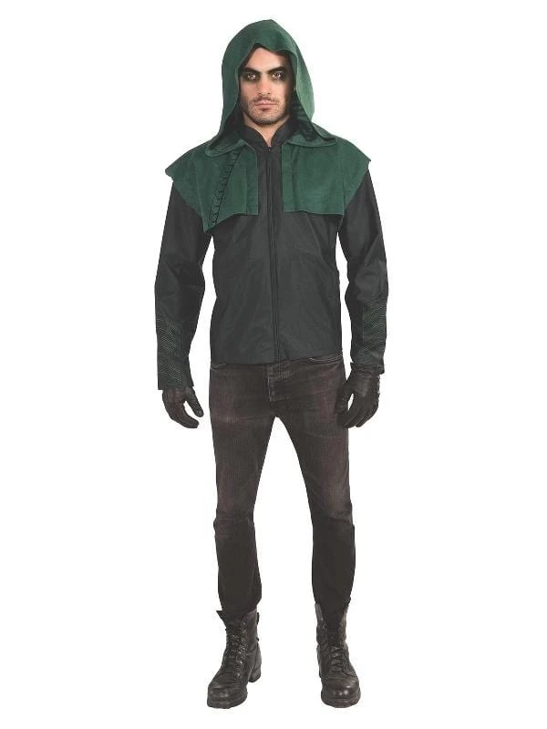 - Green felt mantle with oversized hood attached at shoulders