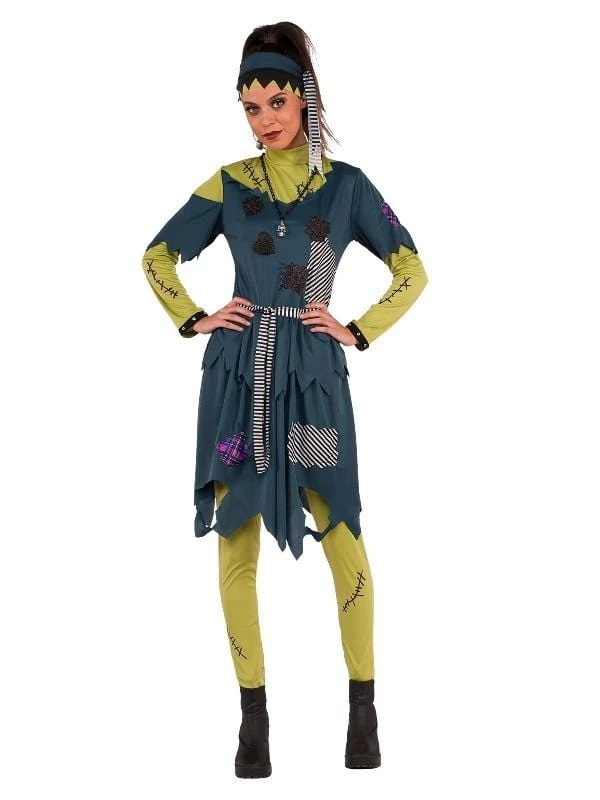 - Dress has long sleeves and printed stitch detail to look like wounds plus high collar with trademark plastic silver bolts at neck