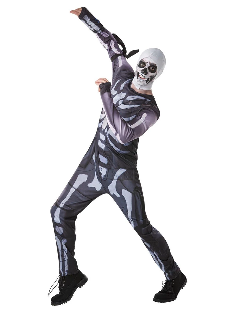 Skull Trooper Costume from Fortnite. He has the male outfit skin with the black and white skeleton and skull face. A skull ranger, he features a black military suit with the skeleton print.