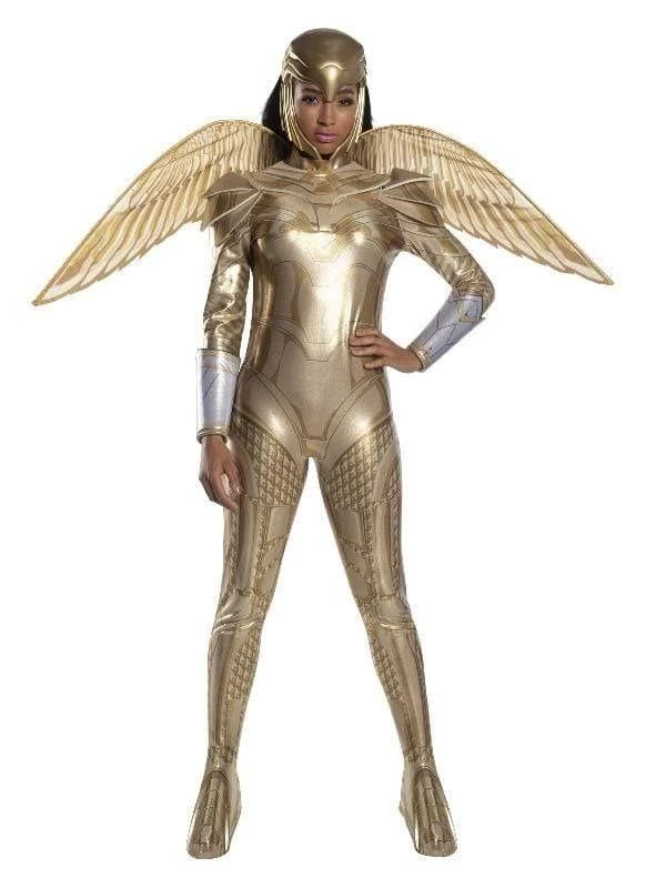 Golden Armour Wonder Woman is Princess Diana of Themyscira Costume. The DC Super-heroine from the Amazonian Jungle, she has super-human strength and speed, and uses trusty weapons like her lasso of truth, her tiara and bullet-proof bracelets. In Stock now! the latest Blockbuster movie in 2020, Wonder Woman 1984. Get your powers on!