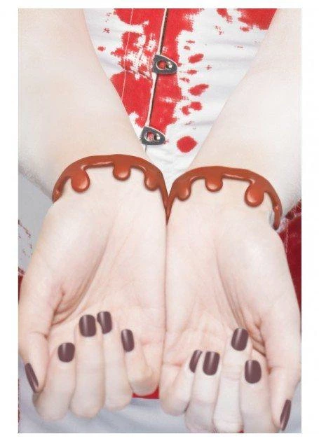 Bright red plastic fake slashed wrist blood drip bracelets. Accessorise with any costume at Halloween. Each packet contains a pair of bracelets. Please note: the colour is bright red, not brownish red like in the photo.Â